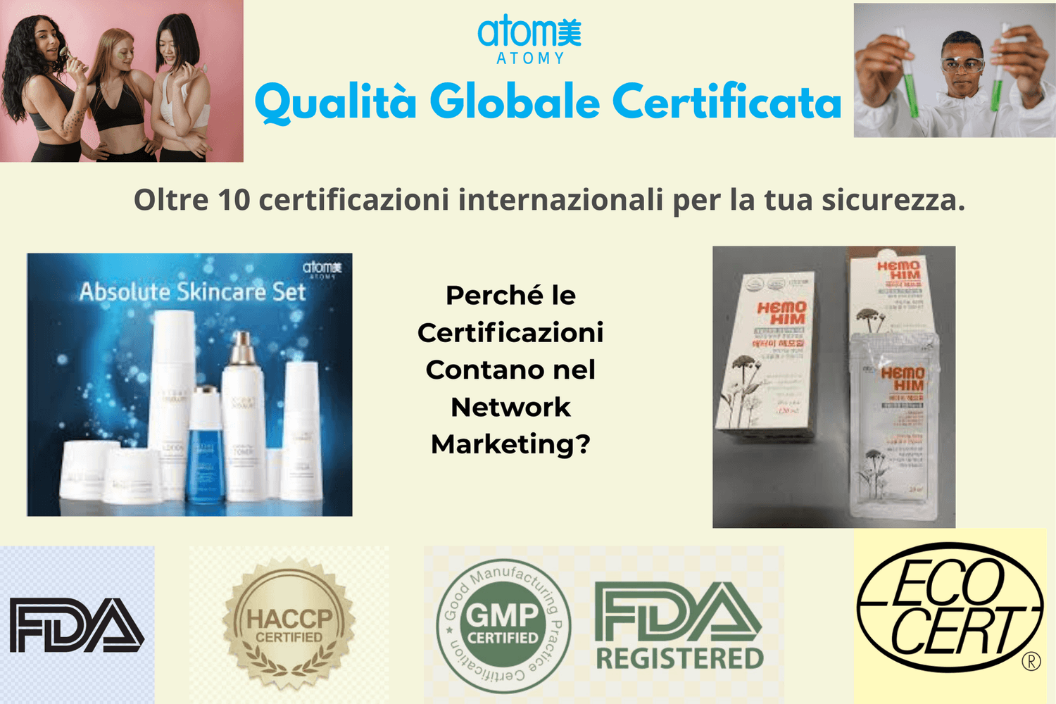 Grazie a questo ampio ventaglio di certificazioni, i prodotti Atomy sono sinonimo di qualità assoluta, sicurezza garantita e trasparenza. Questo è fondamentale per chi, come te, vuole costruire un business di successo nel network marketing, offrendo solo il meglio ai propri clienti.